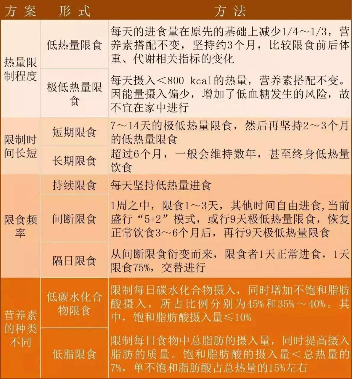限食治疗,也称热量限制(calorie restriction),是指减少每日能量摄取,一般将热量摄入减至每日所需能量的60%~85%,但不致营养不良。限食方案根据时间长短可分为短期限食(一般为7~9 d),长期限食(>9 d)。根据限食频率可分为间断限食(2 d/w 限食,余正常饮食)、隔日限食、连续限食等。不同的研究中限食治疗的效果并不一致,除了上述的限食频率不一致外,可能还与热量限制的程度有关。