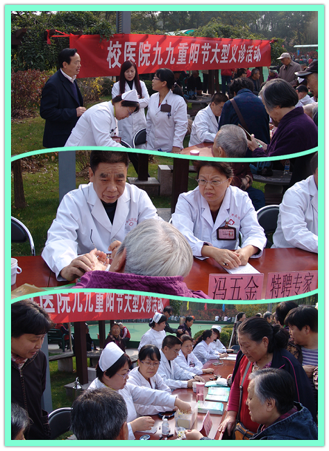 2015年10月20日下午,校医院在学校老年活动中心组织开展“九九重阳节”大型义诊活动。我院外科、中医科、内科、公共卫生科、护理部等专业技术人员参加义诊活动。义诊活动还特邀国务院特贴专家、山西省中医研究院冯五金院长参加。义诊活动中,专家和医务人员免费为老同志们把脉诊病、量血压、测血糖、发放健教资料、提供咨询等服务。学校陶功定书记也亲临义诊现场,对义诊工作提出指导意见,希望校医院能充分发挥自身优势,把医疗保健服务更加贴近社区、更加贴近广大师生员工,不断为离退休老同志和师生员工提供高质量的医疗保健服务。