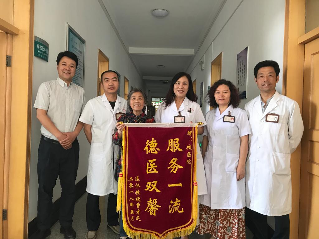 2018年5月29日上午,校医院收到一份珍贵的礼物,我校离休干部曹才芝老师在离退休人员管理处刘彬处长的陪同下,来到校医院,赠送锦旗一面,表达对医务人员的感激之情。曹老师含着热泪、富有感情的讲述了她因病住院期间的感受。5月初,曹老师因急性肠梗阻、急性胃肠炎先后在急诊科、外科、内科就诊或住院,受到医务人员精心治疗和耐心细致的关心和照顾,病情很快得到有效治疗和控制,顺利康复出院。正如曹老师所讲,医院管理有方,医务人员医术精湛、服务贴心才使患者感受到满意和温暖,希望校医院越办越好,为学校师生员工提供更加安全可靠的医疗卫生保障。