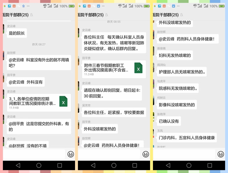 随着疫情形势的日益严峻,校医院对医务人员的自身健康状况更加关注和体恤。为保证医护人员在这场没有硝烟的战斗中不受感染,提出了医务人员“零感染”的口号,这既是对医务人员的爱护,同时也是一项最重要的工作要求。要求医护人员加强自身防护,严格消毒隔离。实行弹性排班工作机制,灵活调整每日上班人员数,在保证工作正常开展的前提下,轮流休息,在家待命。医务人员出现感冒咳嗽等症状,立即安排休息治疗和观察。按照学校防控工作领导组的统一要求和工作部署,每天对全院医务人员的健康状况进行摸排,详细了解是否发热咳嗽等具体情况。