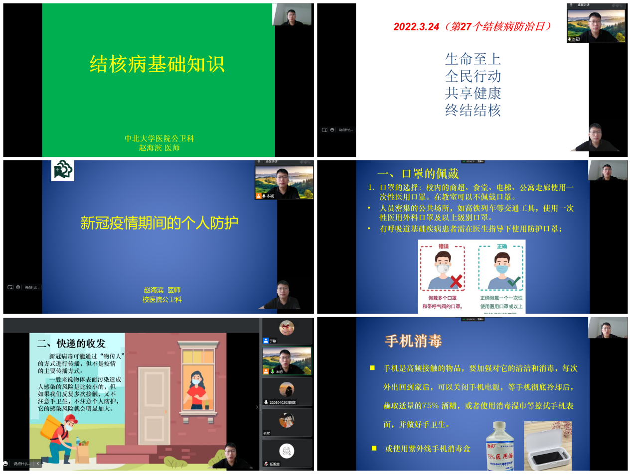新生开学之际,为持续做好新冠疫情防控和传染病防治工作,校医院以“新冠疫情防控、传染病防治知识”为主要内容的“开学健康教育第一课”于9月22日正式开讲,内容主要涵盖新冠疫情期间口罩佩戴方法、快递收发、手消毒、环境清洁通风、症状监测、新冠疫苗接种,以及结核病的发病、传播、常见症状与症状监测、预防、治疗等方面。