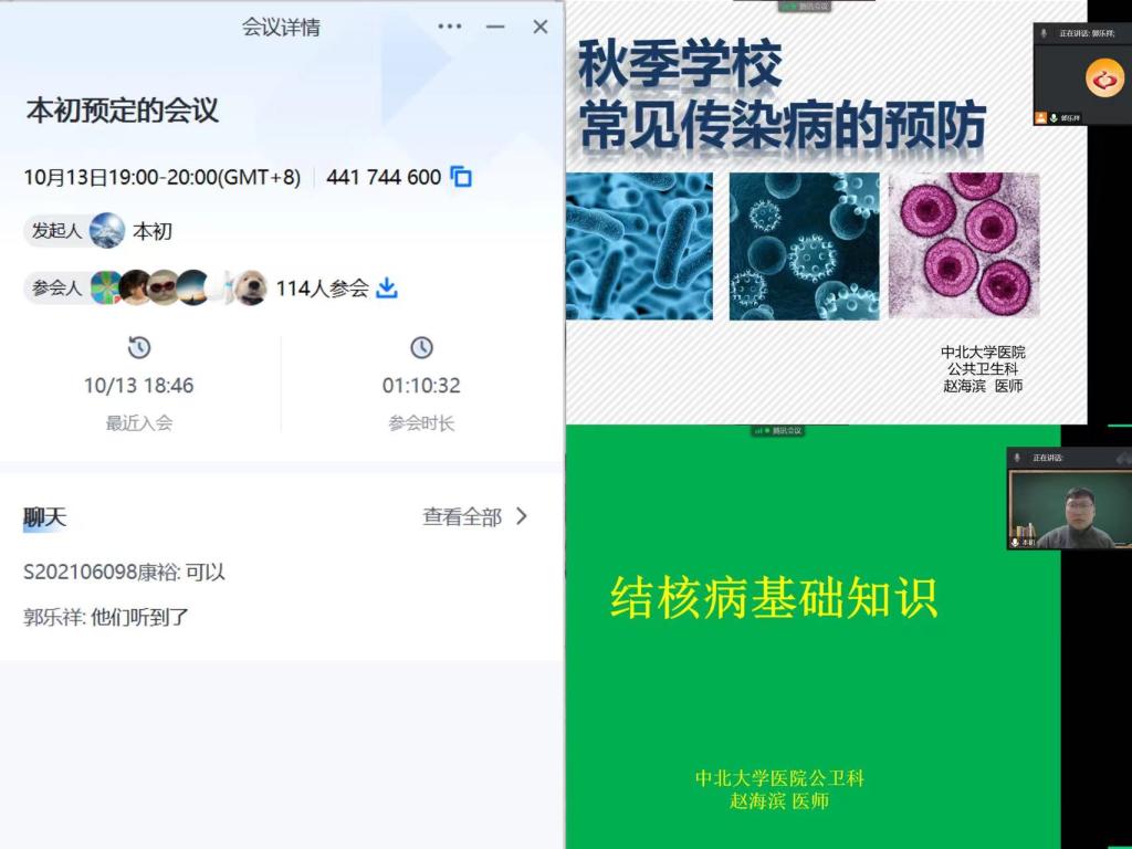 10月13日晚,校医院为仪器与电子学院100余名学生开展了线上健康教育讲座,内容主要涵盖新冠疫情期间口罩佩戴方法、快递收发、手消毒、环境清洁通风、症状监测、新冠疫苗接种,以及结核病、水痘等秋冬季常见呼吸道传染病的发病、传播、常见症状与症状监测、预防等方面。