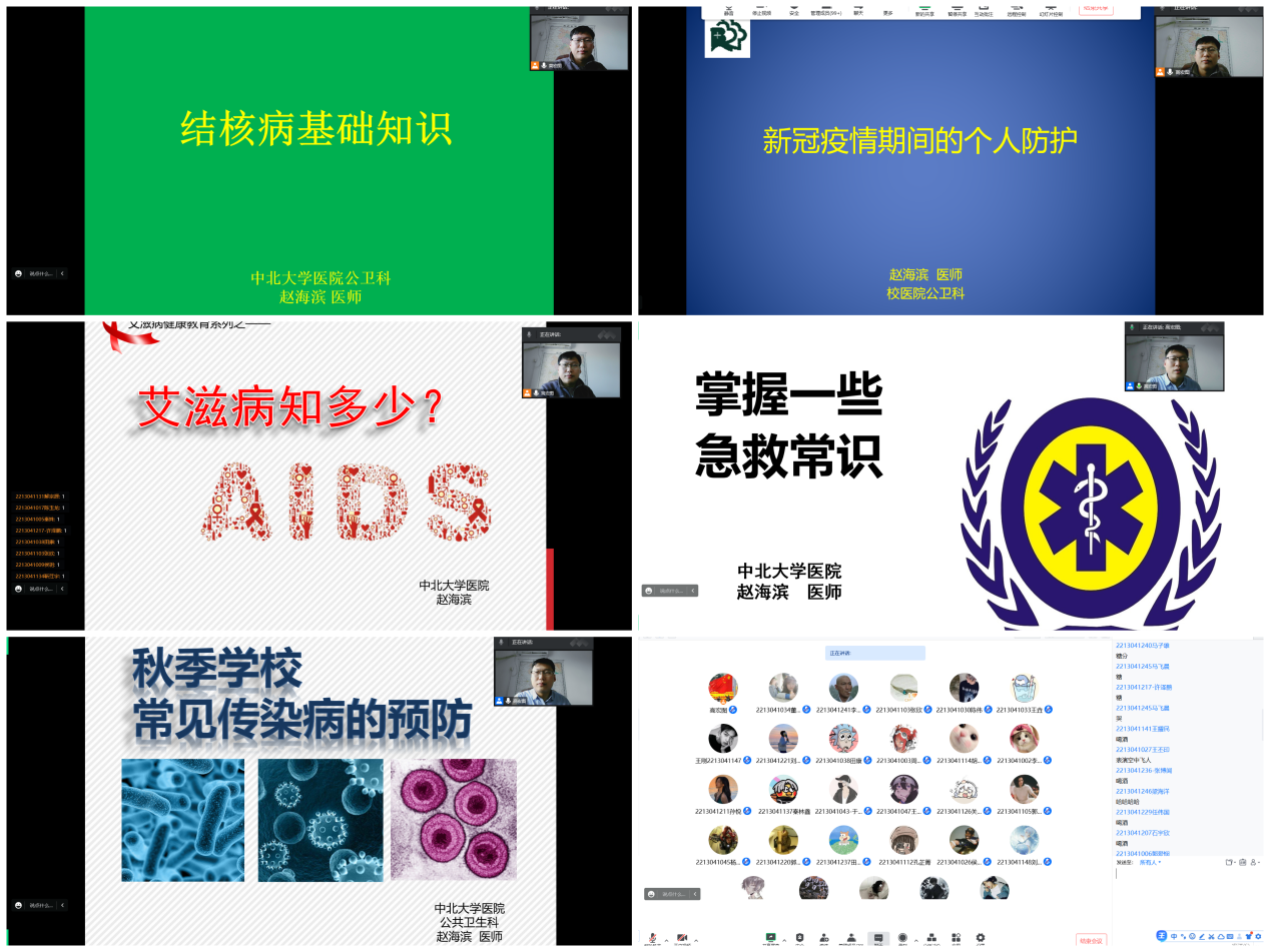 2022年11月-12月,校医院为软件学院2022级学生400余人开展健康教育系列讲座,讲座共三场,以腾讯会议形式开展,内容分别为新冠肺炎的个人防护、结核病、水痘等传染病防治知识、艾滋病基本知识以及院前急救常识。