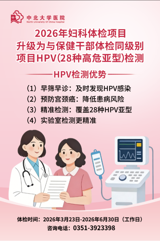 自3月23日正式启动以来,校医院2026年度教职工健康体检工作正在有序进行中。本次体检以“健康聚力双一流,同心奋进新征程”为主题,最显著的亮点是妇科检查项目由TCT检测全面升级为HPV检测(28种高危亚型),对标省级医院保健干部体检标准,为女性教职工提供更加精准、前瞻的健康保障。