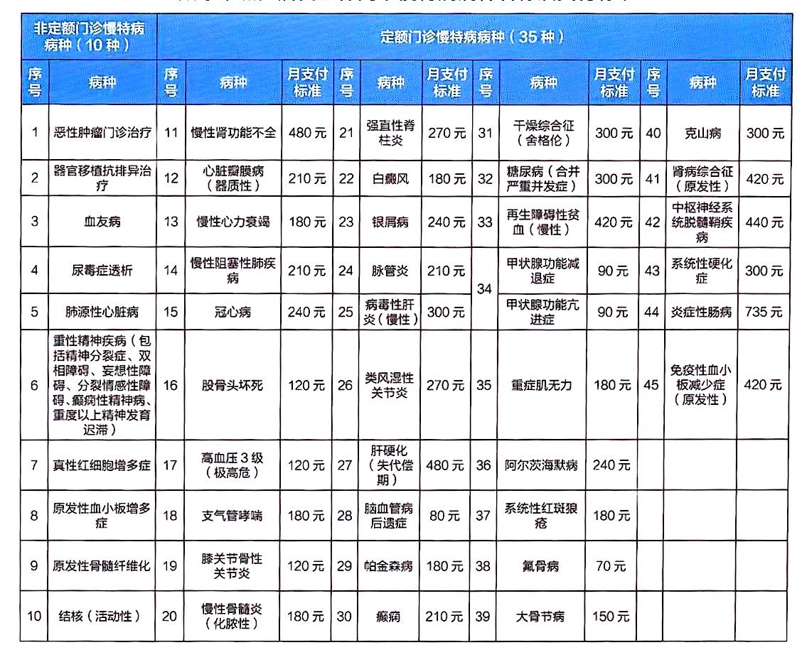 四、门诊慢特病:申请门诊慢特病需携带住院病历复印件去太原市三甲医院医保科申请认定,符合太原市45种慢病标准的会发放慢病本,门诊慢特病病种支付范围内的医疗费用,个人不承担起付标准和乙类项目自付部分,病种最高支付限额内合规医疗费用报销比例为75%。具体病种如下: