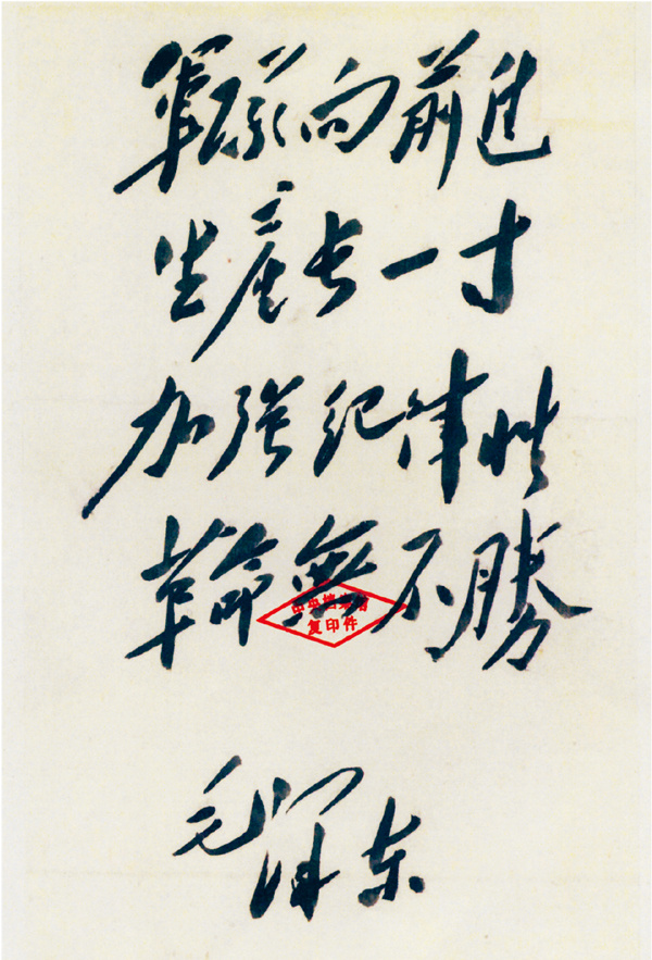 毛泽东在电报中指出,再有一年左右时间即可从根本上打倒国民党。但毛泽东同时又告诫:“要全部解决国民党并占领全国,则尚须要更多的时间。我党我军仍须稳步前进,不骄不躁,以求全胜。我们的口号是‘军队向前进,生产长一寸,加强纪律性,革命无不胜’。”