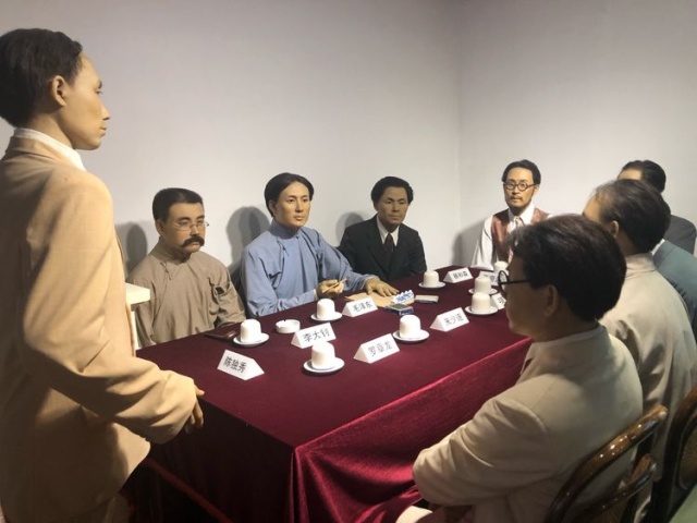 走进纪念馆,首先映入眼帘的是整面浮雕墙。纪念馆内的复原场景中,9位中共三大代表正围坐在长桌旁开会,身着米色西服的陈独秀站立演讲,毛泽东手执毛笔,侧耳细听。