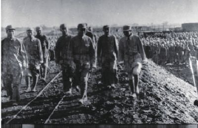 出击陇海路战役前,晋冀鲁豫军区司令员刘伯承、政委邓小平等在检阅部队