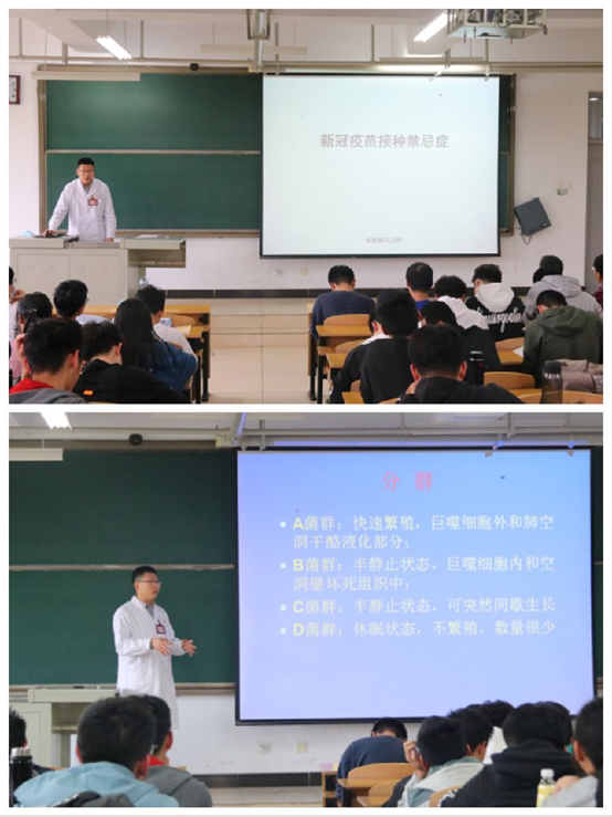 2021年4月27日,校医院在15号教学楼15210H教室为能源动力工程学院学生进行新冠疫苗接种知识科普教育,并开展结核病防治健康教育讲座。本次讲座的主讲人是校医院公共卫生科赵海滨医生,内容主要有新冠疫苗接种注意事项、结核病的校园筛查、预防策略、常见症状及治疗等方面。