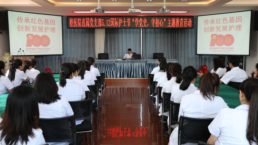 为庆祝中国共产党成立100周年暨2021年“5.12”国际护士节,进一步激励护理人员传承红色经典,礼赞百年党建,守初心,担使命,“牢记嘱托强信念,实干担当蹚新路”,立足岗位,创新发展。5月12日下午,校医院直属党支部组织全院护理人员开展“学党史,守初心”主题教育活动,崔志强副院长、张学娥副院长出席会议,全体护理人员及职能科室主任参加会议。