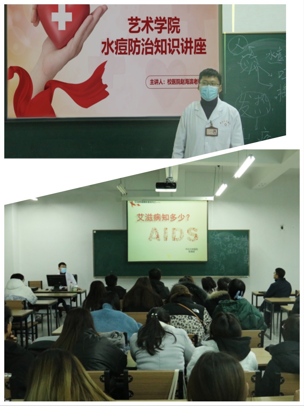 2021年12月1日晚,校医院在9号教学楼09522教室为艺术学院的学生干部开展艾滋病及水痘防治知识健康教育讲座,内容主要涵盖艾滋病的流行、发病、传播、预防以及水痘的发病、症状、传播与预防。